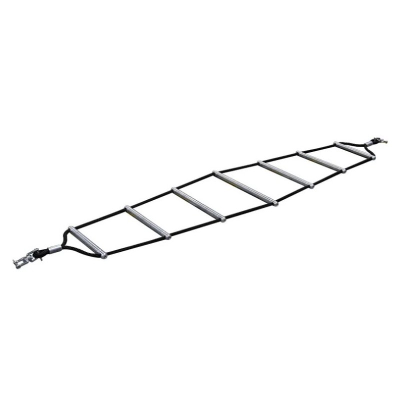 The Brazilian Ladder is made up of aluminium rungs held together by two Ø 16 mm reinforced ropes, crimped with a thimble and fixing ring at each end. Swivels at the ends allow the ladder to rotate, providing a dynamic experience. The variable length of the rungs, from 30 to 45 cm, combined with a 2 m ladder, offers a wide range of events. Lines are available in blue, yellow, green, red, black or beige for customisation.