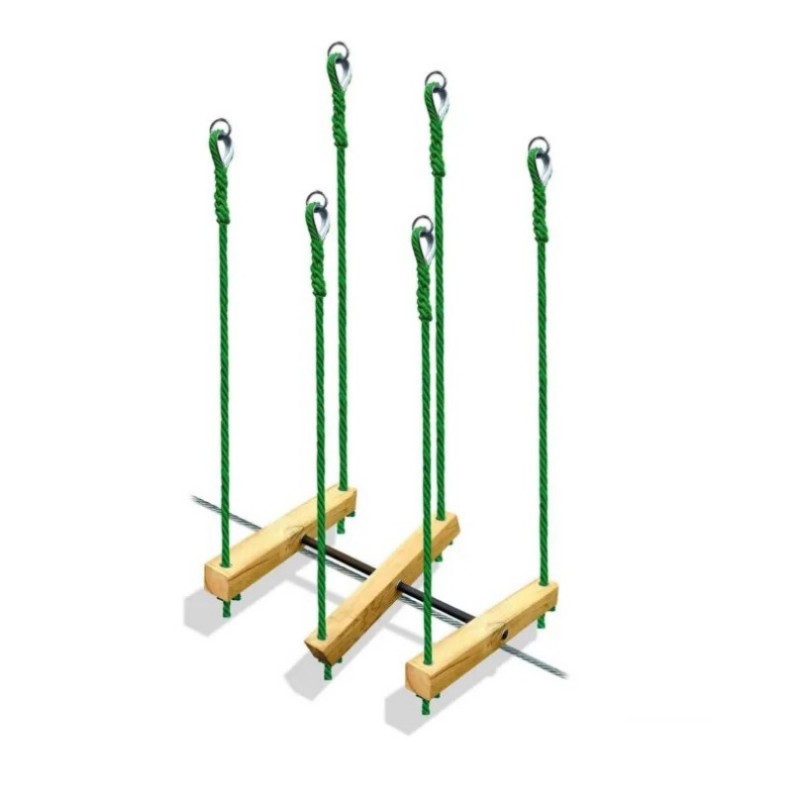 The Dancing Bridge joins the wood modules of the ECO range. It’s a set of 3 posts 90x90mm, held together by a threaded rod Ø16mm passing through and covered by an aluminum tubing ⌀28mm black.This play module is equipped with 6 green-colored Ø16mm Polypropylene rope suspensions at each end. The ropes measure 3m and are supplied with a thimbled loop and ring at the top, and a heat cut at the bottom. So you can decide for yourself how long you want to keep them. All you have to do is tie a knot under the post to hold the module in place.Each rafter is 70 cm long x 8.5 cm wide and 8.5 cm high. The workshop is to be installed on high cables with a spacing of 62 cm.